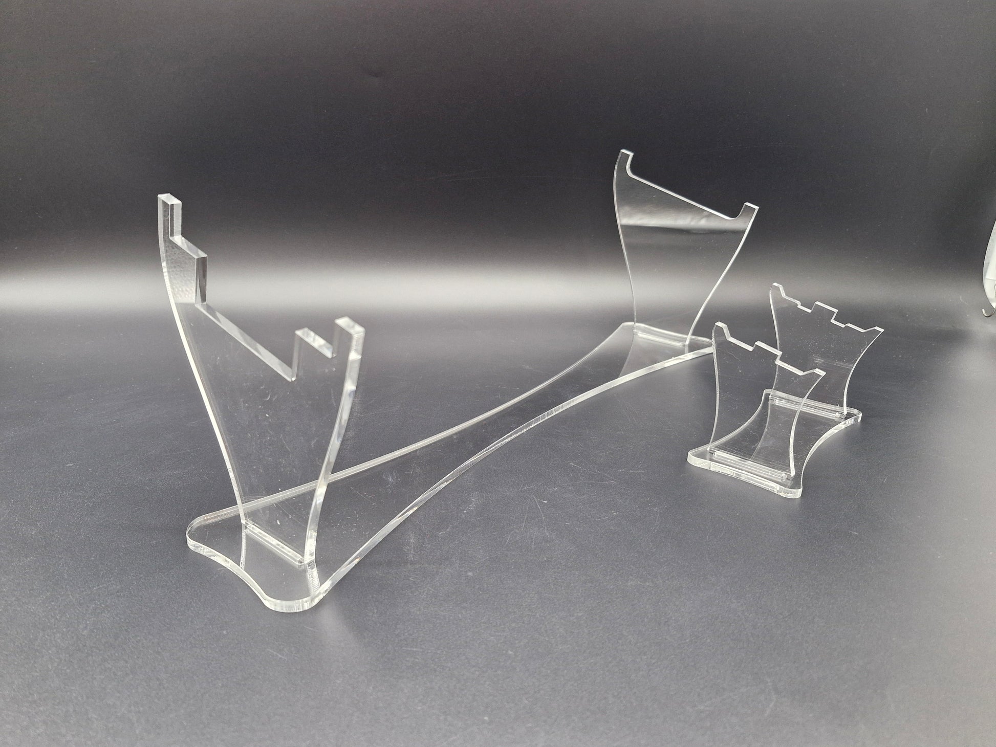 Made of clear acrylic this stand is extremely secure. Item will arrive in protective clear film that needs to be taken off.