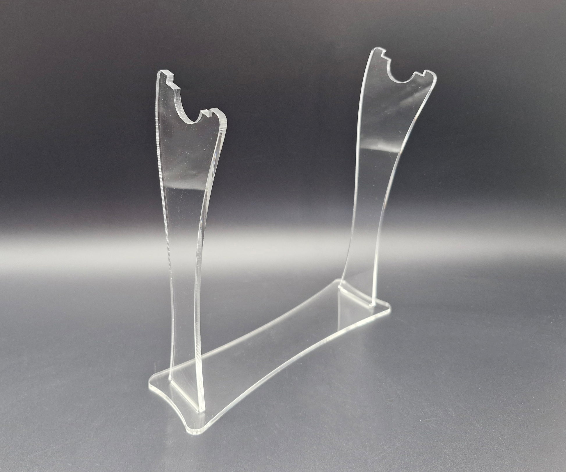 Made of clear acrylic this stand is extremely secure. Item will arrive in protective clear film that needs to be taken off.