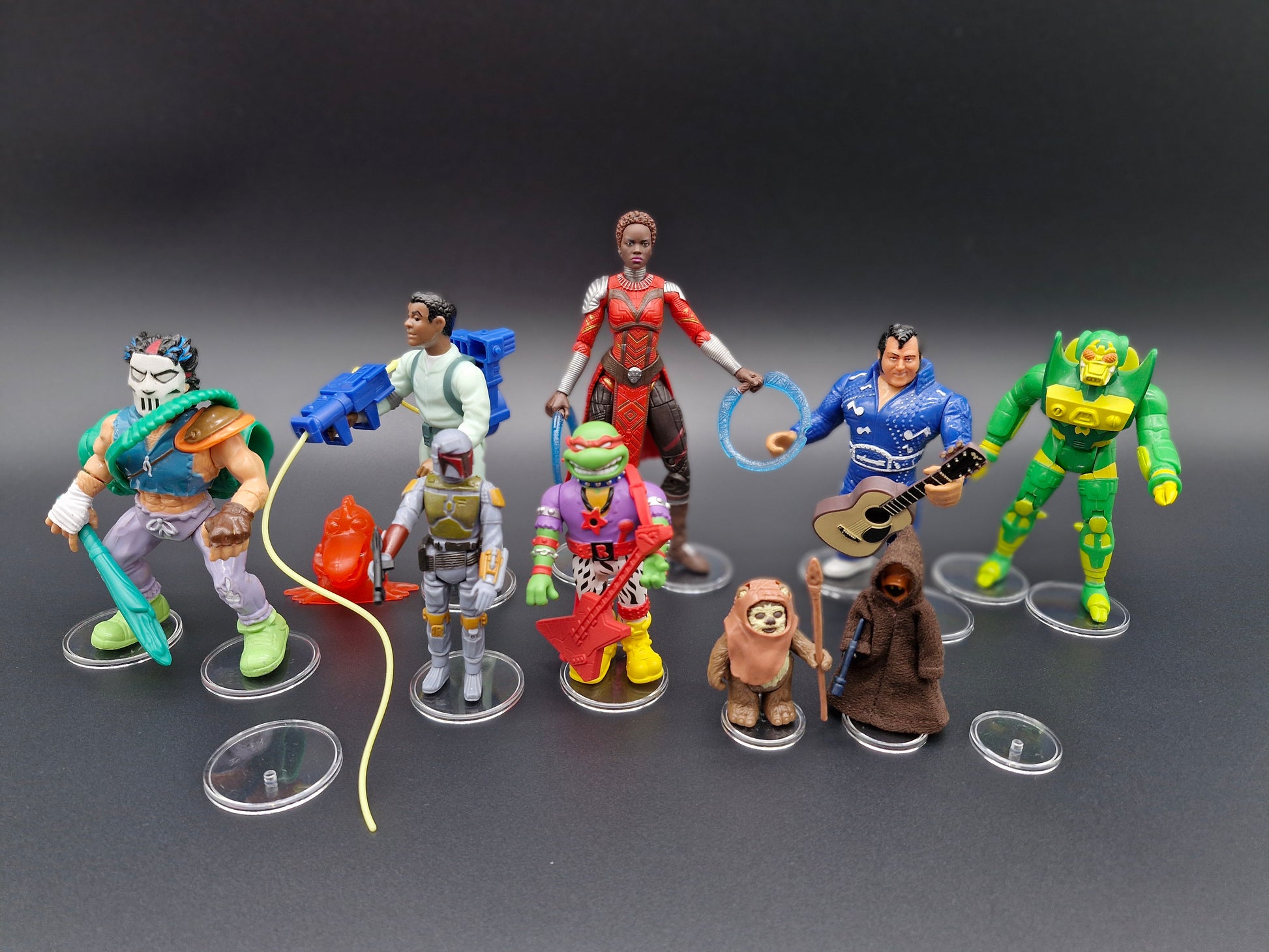 Please note that for the wider stance figures (such as Big Boss Man in picture) you will need 2 stands for the figure. The MAJORITY of this line will fit well. There will be a few odd ones that may have a bigger or smaller peg hole though